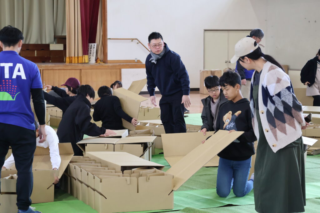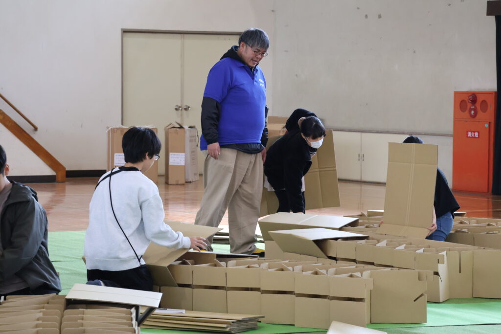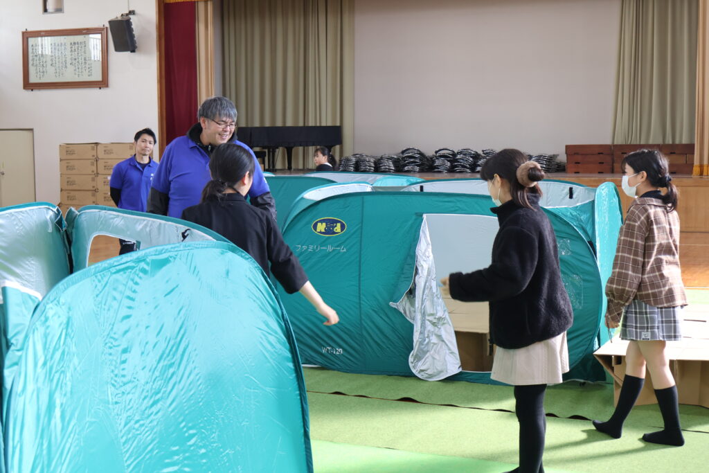 体育館では、ダンボールベッドやテントの設営体験も行われました。慣れない作業に苦戦する様子も見られたものの、友達と声を掛け合いながら一緒に空間をつくっていく時間は、子どもたちにとって忘れられない体験になったようです。