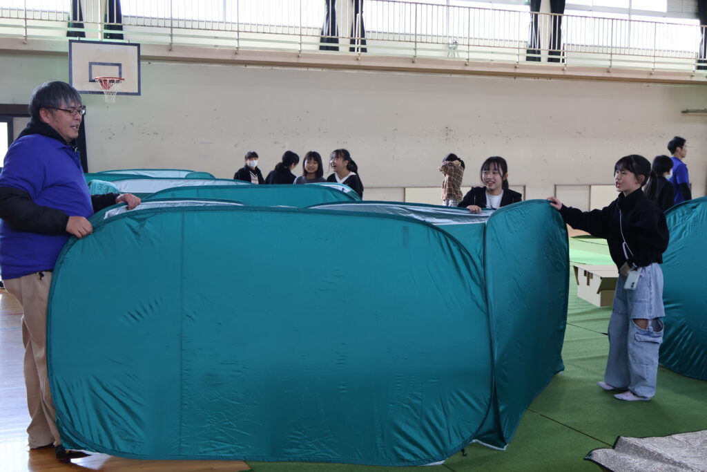 実際に、子どもたちからは「ベッドを作るのが難しかった」という声が上がる一方で、「友達とテントを作るのが一番楽しかった」といった感想も聞かれました。避難所生活を模した体験でありながら、そこには仲間と一緒に過ごす楽しさや、協力することの大切さがしっかりと息づいていました。